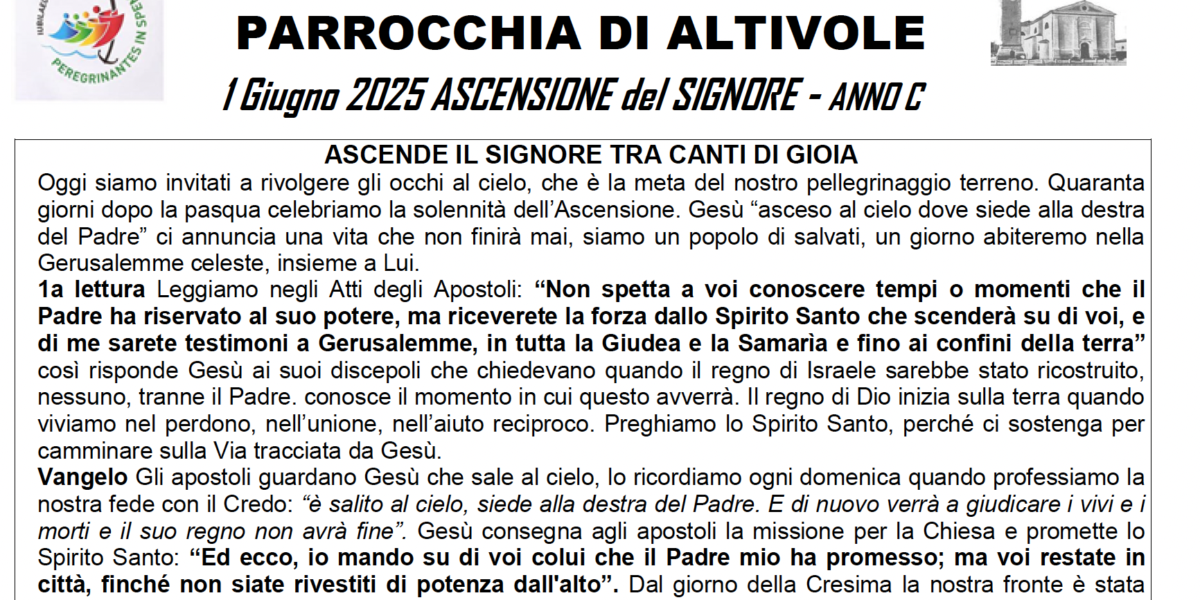 Giu92025AltivoleFoglietti Altivole Scarica il foglietto: Ascensione del Signore Categorie: Altivole, Foglietti Altivole9 Giugno 2025Naviga tra i postPrecedentePost precedente:25 Maggio 2025 – Parrocchia di San VitoSuccessivoProssimo post:1 Giugno 2025 – Parrocchia di San Vito