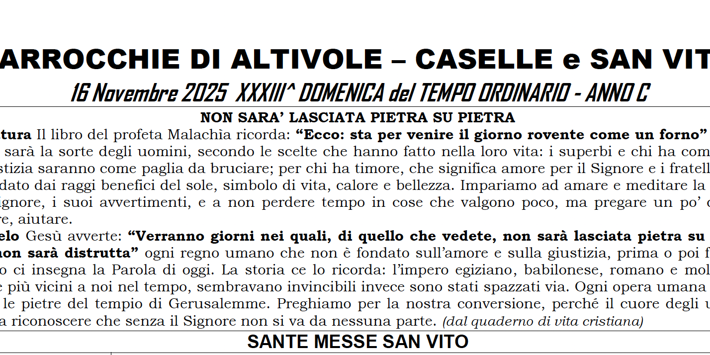 Nov172025Foglietti San VitoSan Vito Apri il foglietto XXXIII T.O. Categorie: Foglietti San Vito, San Vito17 Novembre 2025Naviga tra i postPrecedentePost precedente:I sacramenti dell’iniziazione cristiana: un cammino che continuaSuccessivoProssimo post:16 Novembre – Parrocchia di Caselle