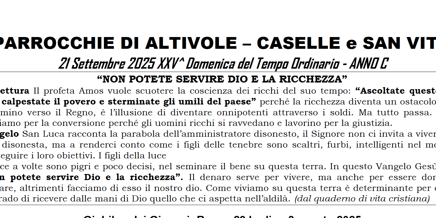 Set222025AltivoleCaselleFoglietti AltivoleFoglietti CaselleFoglietti San VitoSan Vito Apri il foglietto XXV Domenica TO Categorie: Altivole, Caselle, Foglietti Altivole, Foglietti Caselle, Foglietti San Vito, San Vito22 Settembre 2025Naviga tra i postPrecedentePost precedente:Festa di San Michele ArcangeloSuccessivoProssimo post:Giubileo dei Giovani: la forza della speranza