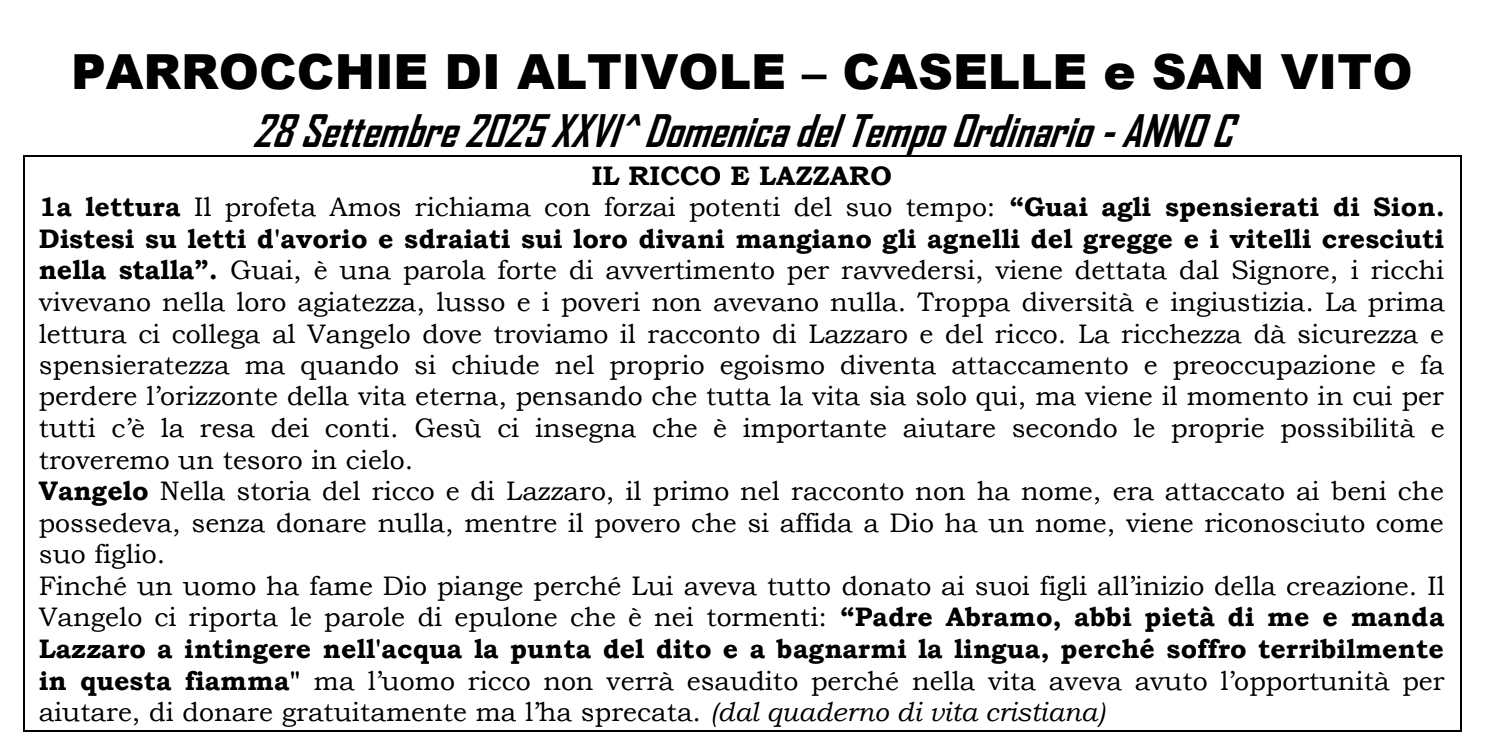 Set272025AltivoleCaselleFoglietti AltivoleFoglietti CaselleFoglietti San VitoSan Vito Apri il foglietto XXVI T.O. Categorie: Altivole, Caselle, Foglietti Altivole, Foglietti Caselle, Foglietti San Vito, San Vito27 Settembre 2025Naviga tra i postPrecedentePost precedente:Giubileo dei Giovani: la forza della speranzaSuccessivoProssimo post:Ci siamo: riparte l’ACR a Caselle!