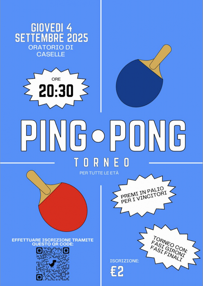 🏓 Torneo di Ping Pong all’Oratorio di Caselle! 📅 Giovedì 4 settembre alle 20:30 🎁 Premi in palio per i vincitori! Il torneo si svolgerà con fasi a gironi e finali ad eliminazione.