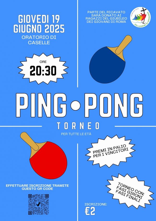🏓 Torneo di Ping Pong all’Oratorio di Caselle!📅 Giovedì 19 giugno alle 20:30🎁 Premi in palio per i vincitori! Il torneo si svolgerà con fasi a gironi e finali ad eliminazione.Una parte del ricavato sarà devoluta ai ragazzi che parteciperanno al Giubileo dei Giovani a Roma. Iscriviti qui Non mancare, ti aspettiamo per una serata…