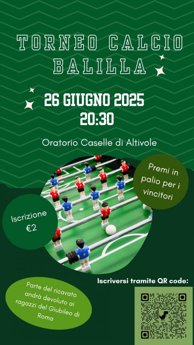 🎯 TORNEO DI CALCIO BALILLA – NOI ORATORIO CASELLE 📅 Giovedì 26 giugno 2025 – ore 20.30Aperto a tutte le età! 🏆 Gironi + Fasi finali👉 Partite al meglio di 2 set da 10 punti🎁 Premi per i primi classificati! 👥 Specifica il tuo compagno nel modulo, oppure sarai accoppiato casualmente! 🍹 Il bar dell’oratorio…