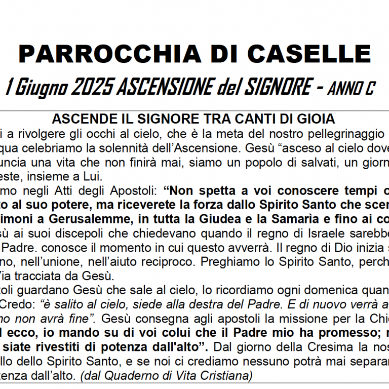 1 Giugno 2025 – Parrocchia di Caselle Caselle, Foglietti Caselle9 Giugno 2025 Scarica il foglietto Ascensione del Signore Leggi...