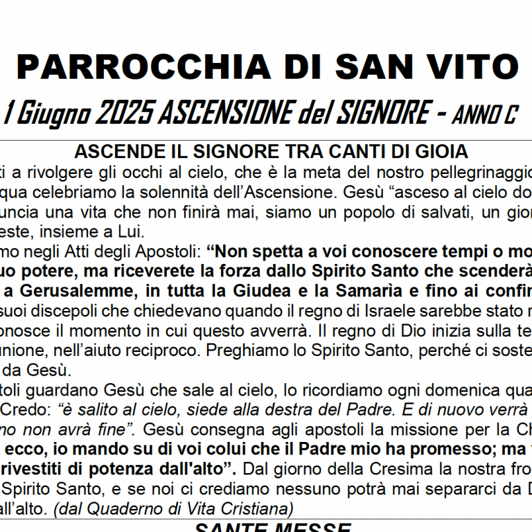 1 Giugno 2025 – Parrocchia di San Vito Foglietti San Vito, San Vito9 Giugno 2025 Scarica il foglietto Ascensione del Signore Leggi...