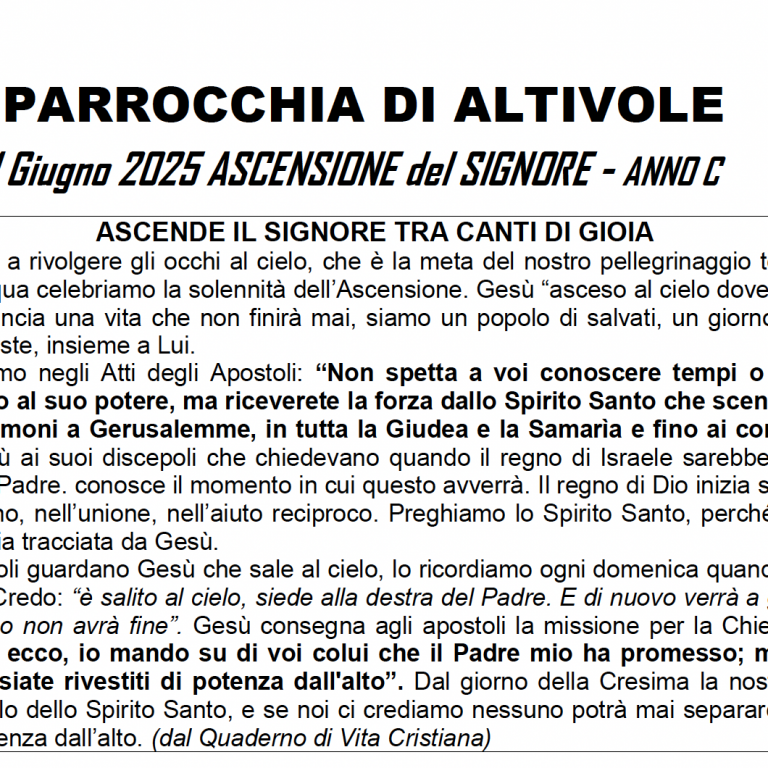 1 Giugno 2025 -Parrocchia di Altivole Altivole, Foglietti Altivole9 Giugno 2025 Scarica il foglietto: Ascensione del Signore Leggi...