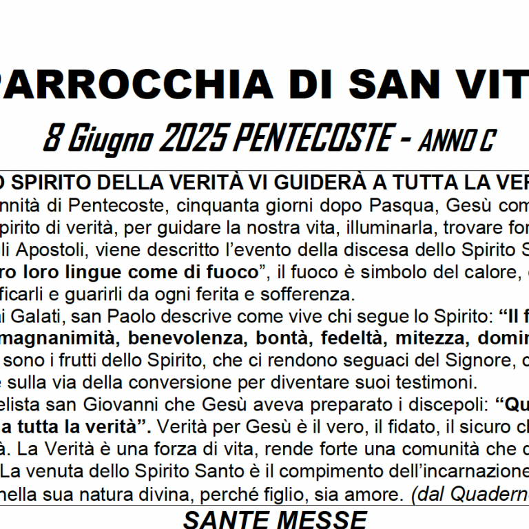 8 Giugno 2025 – Parrocchia di San Vito Foglietti San Vito, San Vito9 Giugno 2025 Scarica il foglietto Pentecoste – SV Leggi...