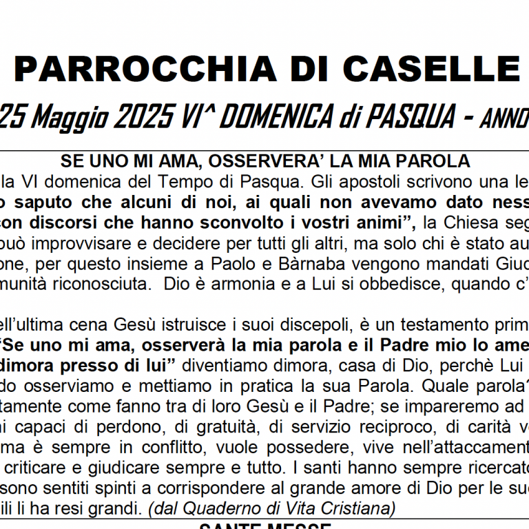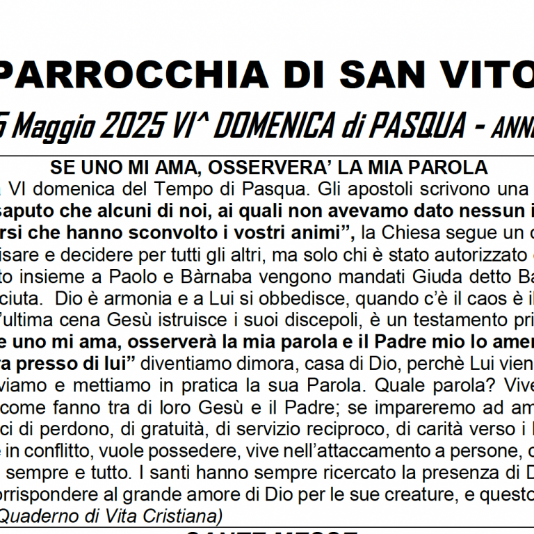 VI^ DOMENICA di PASQUA – ANNO C SE UNO MI AMA, OSSERVERA’ LA MIA PAROLA Scarica il foglietto…